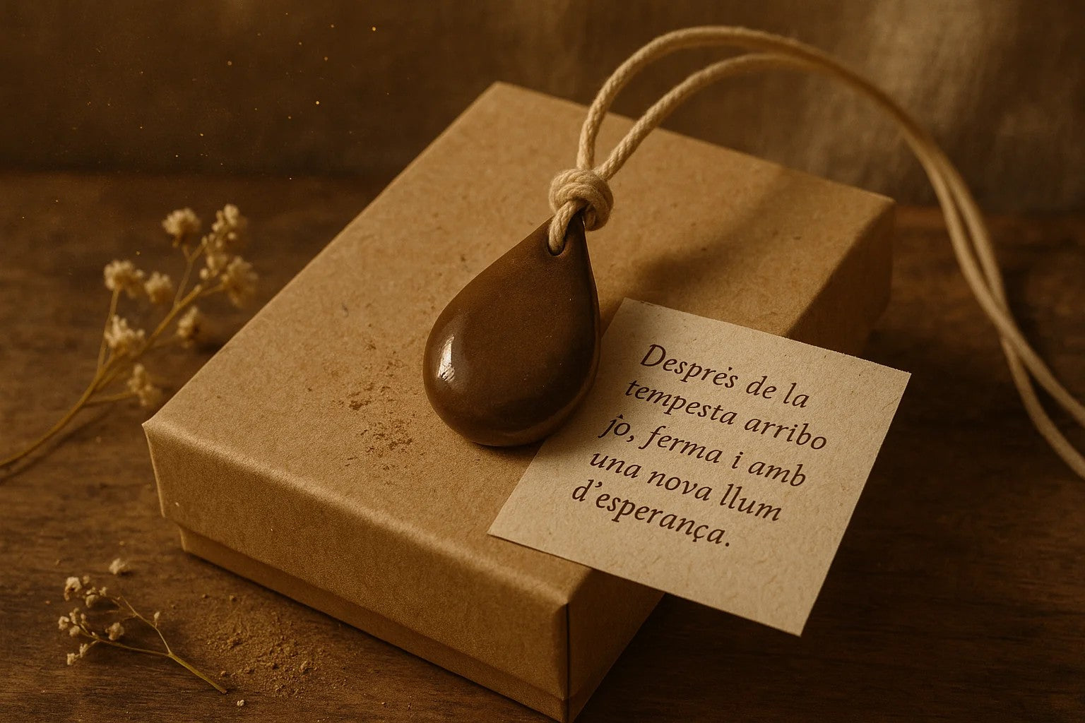 Gota de cerámica hecha a mano, esmaltada en marrón profundo. Cordón de algodón natural, sin tintes. Cada pieza está elaborada artesanalmente en Valencia, una a una.