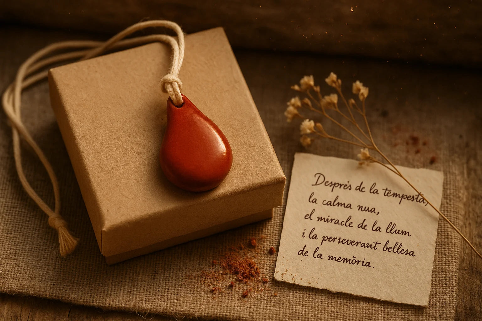 Gota de cerámica artesanal, esmaltada en rojo terracota. Cordón de algodón natural, sin tintes. Hecho a mano en Valencia, con el cuidado de lo que se hace para durar.