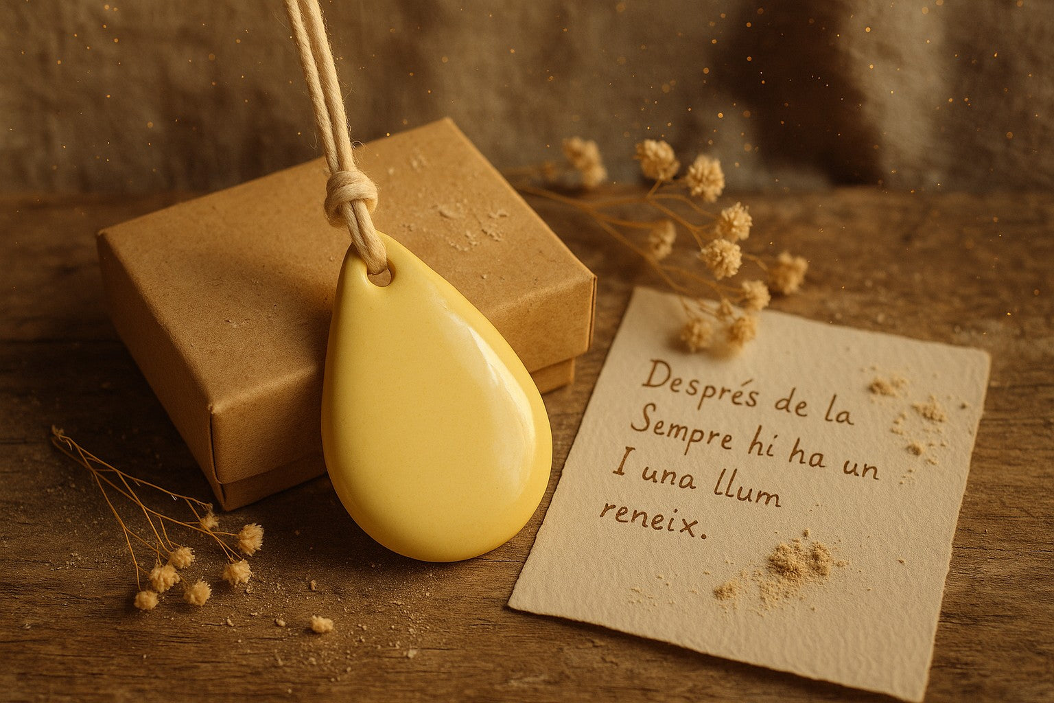 Este colgante representa esa chispa que vuelve a brillar cuando todo parecía apagado. El amarillo suave, casi dorado, envuelve la pieza como un rayo de sol que se filtra tras una nube espesa: inesperado, cálido, lleno de vida.